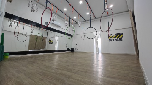 Our studio provides a self-practice space which is a comfortable and clean room with high ceilings (10-15feet) to accommodate various aerial equipment such as hoops and hammocks. The space features secure rigging points with heavy-duty hardware and thick crash mats for safety. Walls have large mirrors for checking form, and there is also a sound system for playing music during practice.