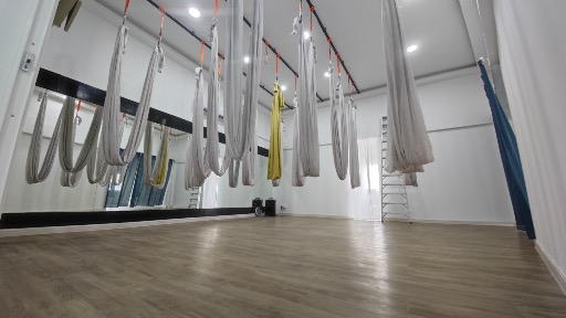 Our studio provides a self-practice space which is a comfortable and clean room with high ceilings (10-15feet) to accommodate various aerial equipment such as hoops and hammocks. The space features secure rigging points with heavy-duty hardware and thick crash mats for safety. Walls have large mirrors for checking form, and there is also a sound system for playing music during practice.